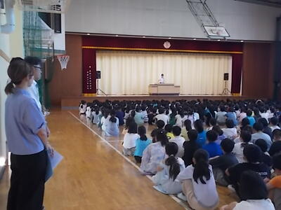 まだまだ暑い日が続くようですね・・・今日は1年生の人権教室。講師の秋吉マツ先生が、「人権」のことを鬼ごっこなどの具体的な場面とやさしい言葉で教えてくださいました。