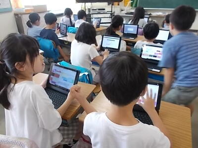 2年生はタブレットを使った学習。「2学期楽しみなこと」を書いて、クラスのみんなで「みてみて!」とそれぞれの考えを共有。その後「いいね」をしたり、「もっと書こう」と画面にむかったり。