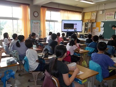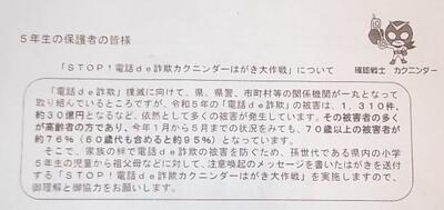 やっと朝晩涼しくなってきましたね。5年生の教室には、ていねいで、たいそうまじめなトーンの音声が流れていました。大型テレビの画面を見ましたら「犯人」という文字にびっくり。高齢の方に「あなたの個人情報が流失していますよ」という詐欺電話をかけている犯人の実際の音声だったのです。しーんと聞いていた5年生も、犯人の巧妙な話術に「これじゃあ、だまされちゃうね。」とつぶやいていました。