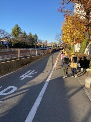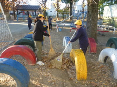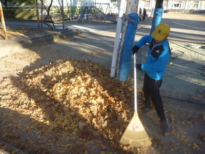 落ち葉はきが始まってしばらく経ち、用務員の大関さんが、集めた落ち葉をまき散らして遊ぶ低学年の子を見かけたそうです。「小さい子だから仕方ないな」と思いつつ声をかけるタイミングをはかっていたところ、通りかかった高学年の子が、「集めるのがたいへんだからやめようね。」と声をかけ、自分から元の場所に落ち葉を集め始めました。それを見ていた低学年の子も、元に戻していたとのこと。