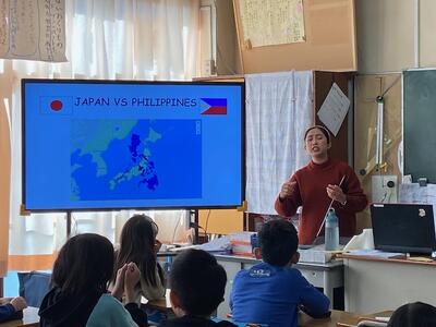 3年生は、初めて会うメアリー先生と、メアリー先生の母国フィリピンと日本の面積の違いや距離についての学習を。