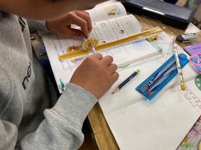 5年生の教室では、何やら子供たちが真剣に紙を折っています。近づくと長細い紙を山折り谷折り、丸い円盤を鉛筆に刺して、細長い紙の谷の部分をころころ・・・