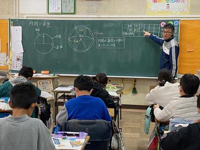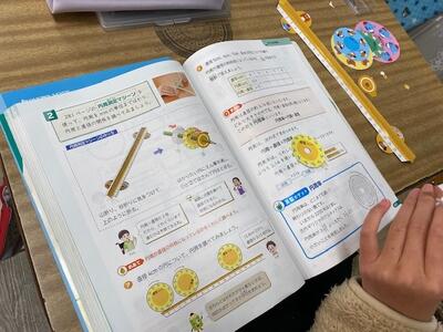 直径の長さがわかっている円盤を一回転させ、その距離から円周率を割り出す算数の授業でした!ただ「3.14」と暗記するのではなく、体験的に学ぶことができるよい学習教材ですね。