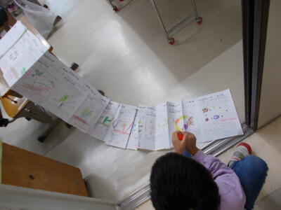 今日で令和4年度の前期が終了です。1年生の教室に行きましたら、長い長いアサガオの観察カードが。子供たちは種から育てたアサガオと一緒にこれだけの時間を学校で過ごしたのですね。夏休みの水やりも頑張り、種取りをし・・・そして、つるを使った立派なリースが出来上がりました。後期の飾りつけが楽しみです。
