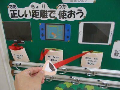 保健室の掲示の赤いリボンを子供たちが引っ張っています。よく見ると、スマホやゲーム、テレビ画面を見るときの目との距離を体感できるようになっているのでした。養護教諭さんの工夫にはいつも感心します。