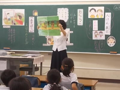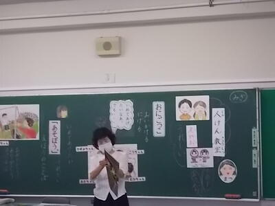 まだまだ暑い日が続くようですね・・・今日は1年生の人権教室。講師の秋吉マツ先生が、「人権」のことを鬼ごっこなどの具体的な場面とやさしい言葉で教えてくださいました。