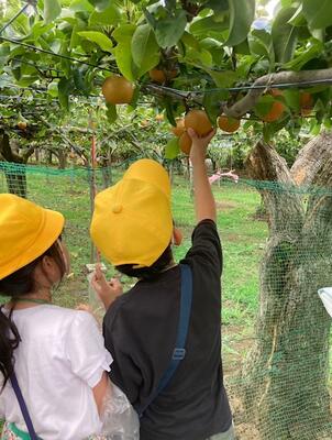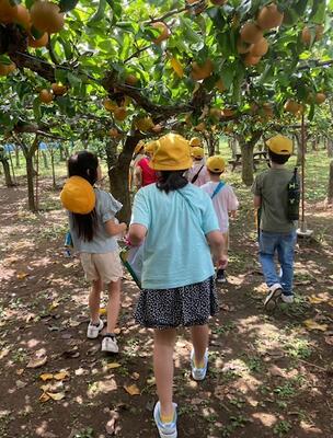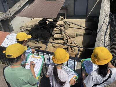 「初清園」に到着し、梨農家見学・梨狩り体験をしたあと、市川市動植物園で動物の生態を学んでいます。