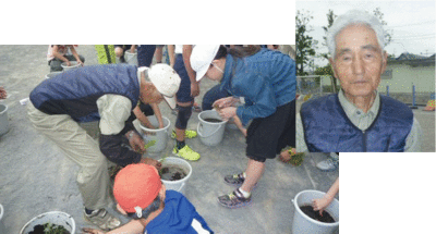 菅野にお住まいの田中さんは、毎年、真間小の5年生の社会科の学習や、総合的な学習の時間の「米作り」を支援してくださっています。真間小プール脇の花壇に田んぼをこしらえてくださり、もっと小さな田んぼとしての「バケツ稲」を、どう管理しながら育てていったら良いかなど、子どもたちに親切に教えてくださっています。