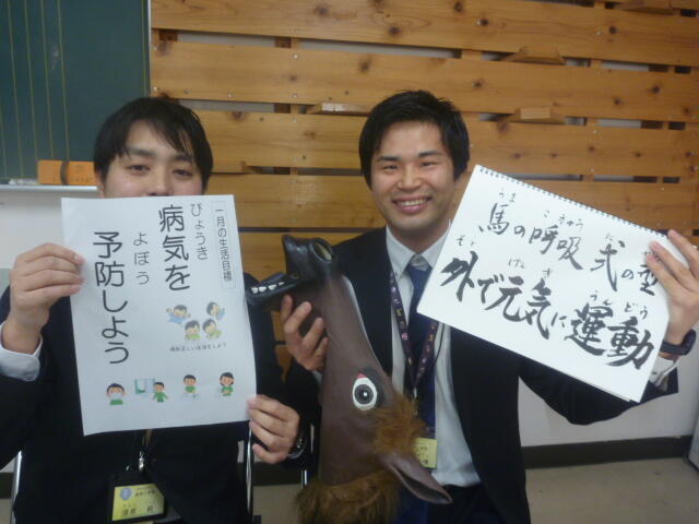 今日は初日だったので、オンラインの朝会で1月の生活目標を確認しました。話をしてくれた先生の隣になぜか馬が!