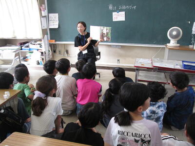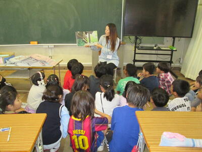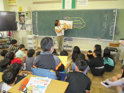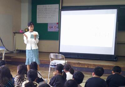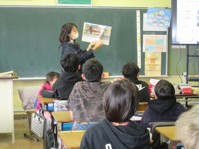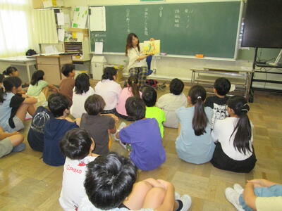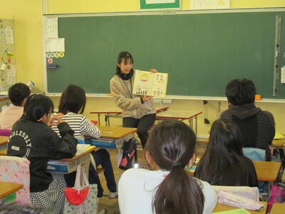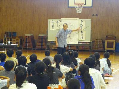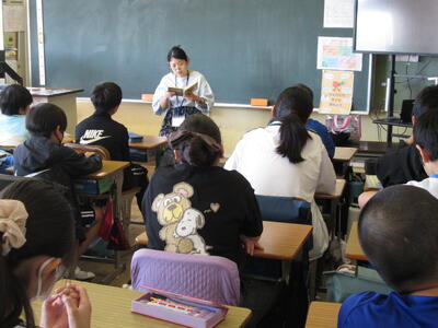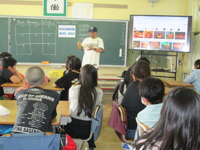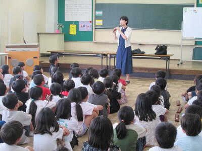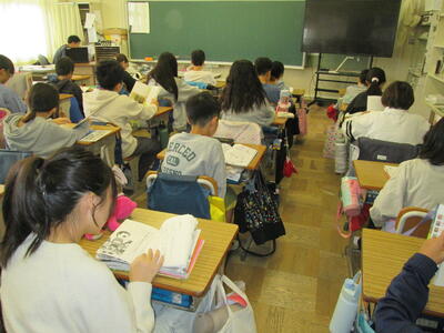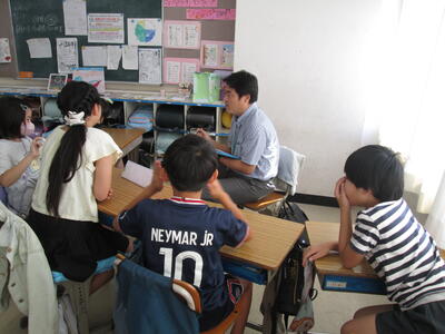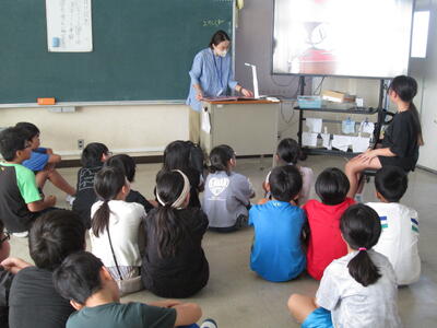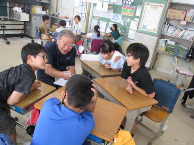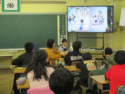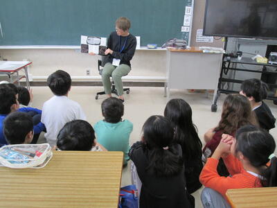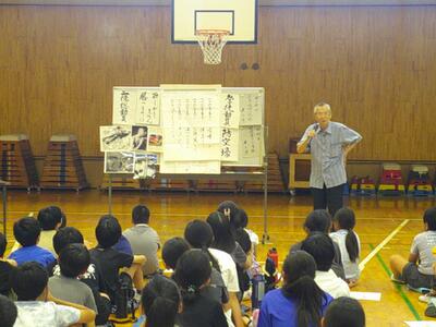 ご自身の体験を通して、友達の大切さ、学ぶことの大切さを話していただきました。また、氏は戦争の悲惨さ、愚かさ、絶対に繰り返してはいけないということを、私の後に第二走者としてバトンを受け継ぎ、語っていってほしいと話されました。子どもたちは、皆真剣に話を聞いていました。話を終えられた氏に、「ぼくがバトンを受け継いでいきます!」と話す子もいました。