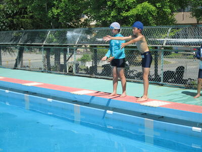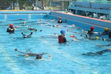 まず衣服を着たままプールに入り、衣服の重さで動きにくくなくなることを体験しました。