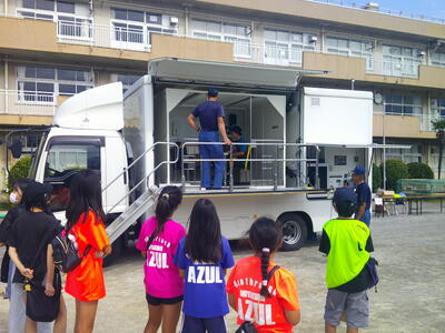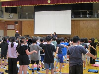 全体で消火訓練を見学した後、3年生は起震車体験、6年生は煙中脱出訓練、4・5年生は宮久保小が避難所になった際の体育館の様子を、防災拠点協議会の方の御協力のもと、見学しました