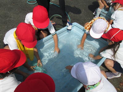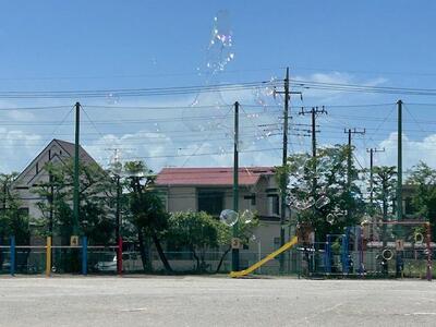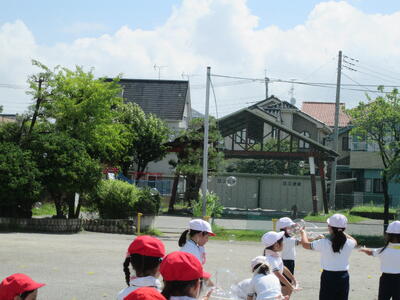 はじめはなかなかシャボン玉ができず苦労していましたが、だんだんコツを覚え大きなシャボン玉がたくさんできました。