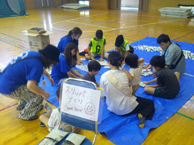 グループごとに相談し、折り紙飛行機を飛ばしたり、新聞を使ってゲームをしたりと工夫して遊ぶ姿が見られました。
