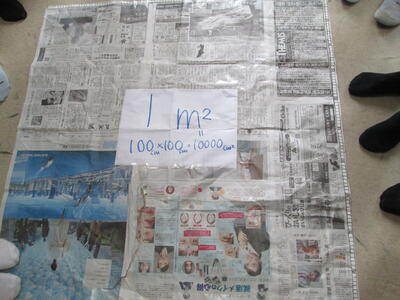 新聞紙で作った1㎡の正方形から、身の回りの面積を調べようとしていました。