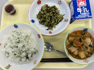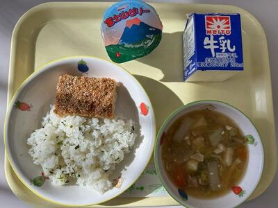 ごはん・牛乳・豚肉のかりんと揚げ・千葉野菜のみそ汁・小松菜のふりかけ