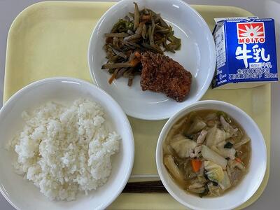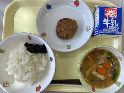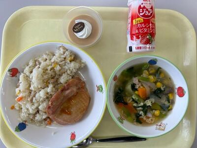 たけのこピラフ・牛乳・キャベツメンチ・大豆と野菜のスープ