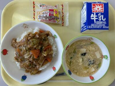 ごはん・牛乳・ホイコーロー丼の具・サンラータン・スイートポテト