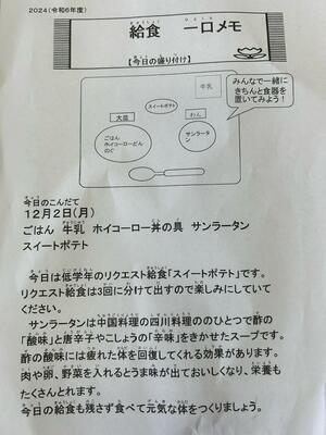 サンラータンは給食では酸味も辛みも抑えてあるので食べやすいです。