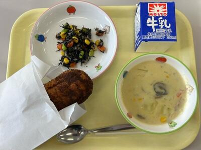 ココア揚げパン・牛乳・コーンシチュー・ささみとひじきのサラダ