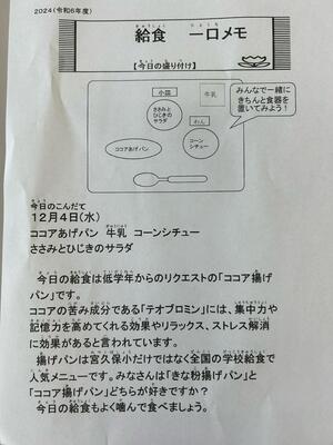 今日は低学年のリクエスト給食の「ココア揚げパン」です。ほんのり甘くていくらでも食べられそうです。