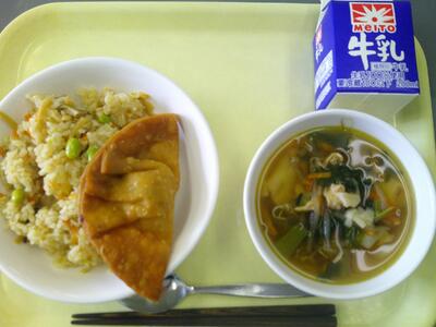 五目中華ご飯・牛乳・揚げ餃子・ワンタンスープ