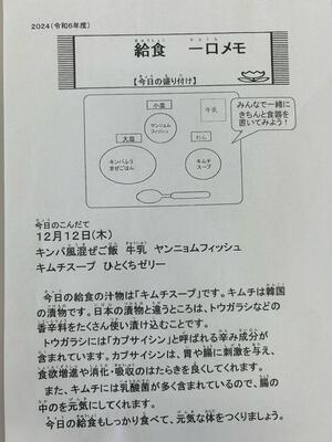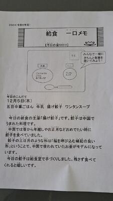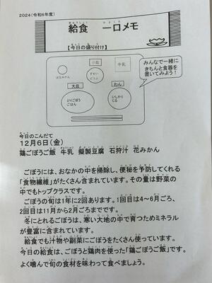 栄養バランスをよく考えて毎日給食は作られています。根菜がたくさん入ったけんちん汁ですが、お箸を使って上手にいただきたいですね。