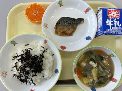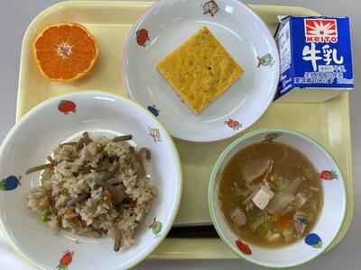 鶏ごぼうご飯・牛乳・擬製豆腐・石狩汁・花みかん