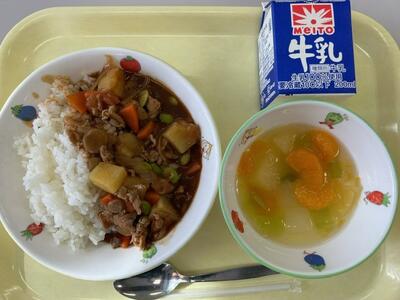 ターメリックライス・牛乳・チリコンカン・ABCスープ・オレンジ