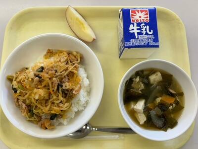 親子丼・牛乳・みそけんちん汁・りんご
