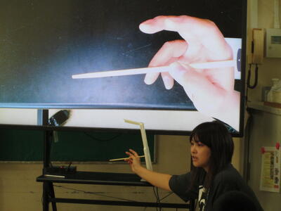 1年生が、栄養士の先生と一緒に正しい箸の持ち方について学習しています。