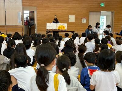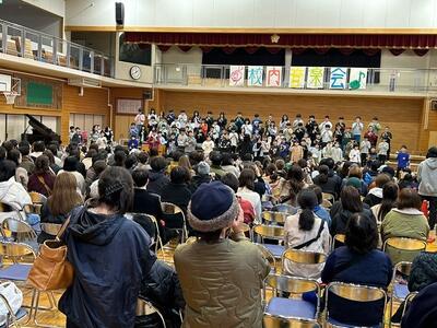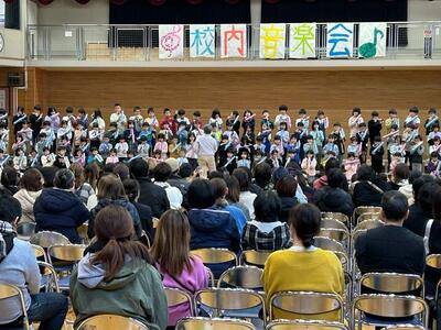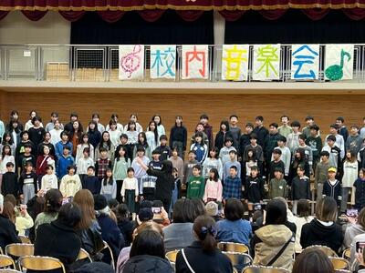 昨日の保護者向けに続き、今日は全校児童が体育館に集合し、音楽会が開かれました。