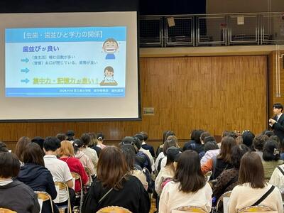 子どもたちの健診中、保護者の方へ本校の学校医より虫歯・歯並び予防について講演していただきました。