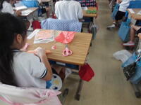 6年生 家庭科 エプロン作りに、お母様方のお力をお借りしました。おかげさまで、スムーズに進みました。