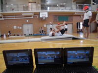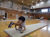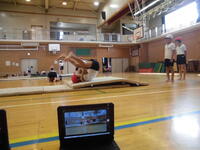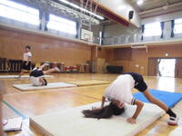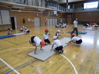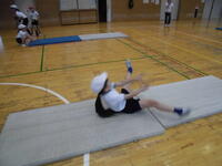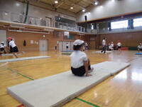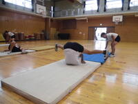 マット運動の後転系の技に挑戦しています。自分のいいとこと、悪いところ見つけるためにタブレットを活用しています。