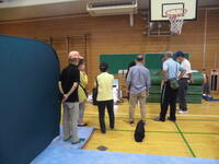 心肺蘇生法の体験です。 新聞紙スリッパで歩いてみます。お話サラダさんのメンバーが中心となり新聞紙スリッパの作り方おしえてくれました。