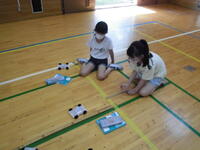 体育館で説明を聞いて、横断歩道の渡り方を練習しました。外では、トラックも実際入ってきて、どんな危険が隠れているか学習しました。