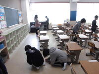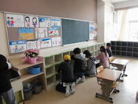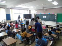 1年生の朝の教室の様子・・・6年生が手伝いに来ています。頼りになる6年生です。