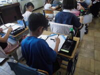 ICT支援員さんと一緒に、タブレットを使って学習です。 理科で風の力の学習をします。 英語も始まりました。