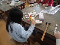 3年生の木工もかなり形が見えてきました。 こだわりで、細かくのこぎりで切っている子もいます。