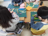 2年生 図画工作 台紙にカッターで切れ目を入れて、織物の要領で織り込んでいきます。色使いがきれいな子も多かったです。