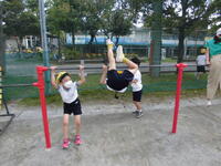 高鉄棒に 低鉄棒こちらは1年生 2年生は先生も交じって鬼っごっこ、私も誘われました。