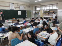 社会科では消防署の 教頭先生と一緒に 毛筆 図工の作品作り