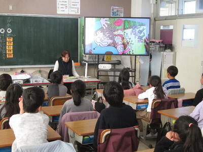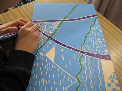 初めて彫刻刀を使う4年生が、いろいろな彫り方を使った作品に取り組み始めました。