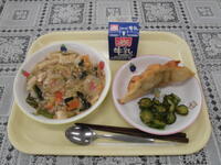 豆腐と野菜のあんかけ丼(麦ごはん) かぼちゃの揚げ餃子 ネギたれキュウリ 牛乳
