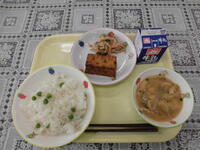 生揚げの和風カレー丼(麦ごはん) 茎わかめと小松菜のおかか和え さつまいものかりんとう 牛乳
