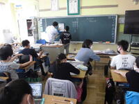 時候の挨拶を調べていました。 外国語担当の先生が発音した 絵を指します。ペアの人と競争です。