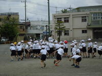 1年生も、学校探検の後、玉入れの練習を行いました。この「元気」で雨雲を吹っ飛ばします。