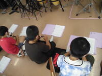 全員一度、打楽器(木琴、鉄琴)の経験をしてみます。叩く位置やたたく強さ、確認しながら体験していました。