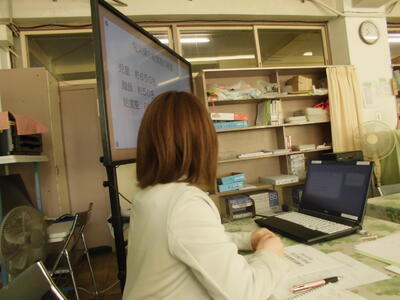 プレゼンテーションソフトを使い、行事給食やお話給食、全国学校給食週間や食育など普段の取組を紹介しました。